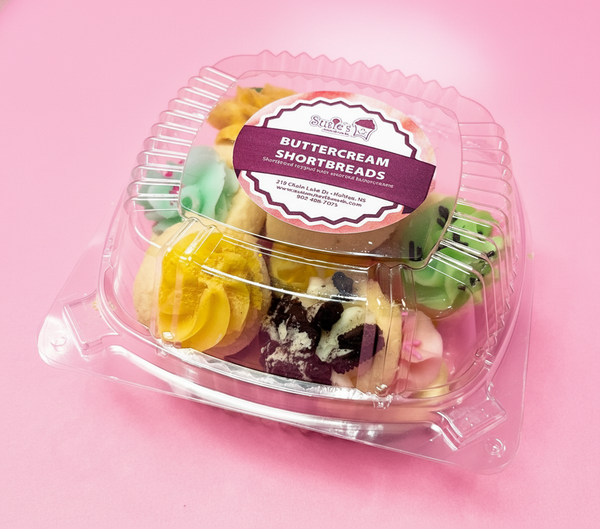 Buttercream Frosted: plain shortbread topped with assorted flavours of our homemade buttercreams (one dozen per value pack).